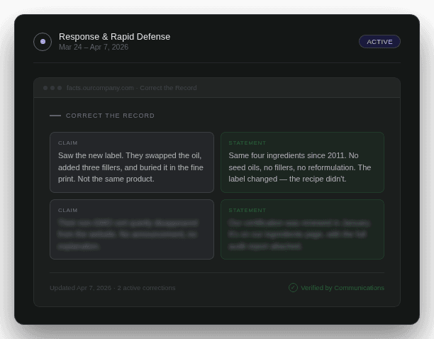From narrative takedowns to GEO-optimized brand fact centers to rapid response briefings. Clear intelligence and recommended actions before damage is done.