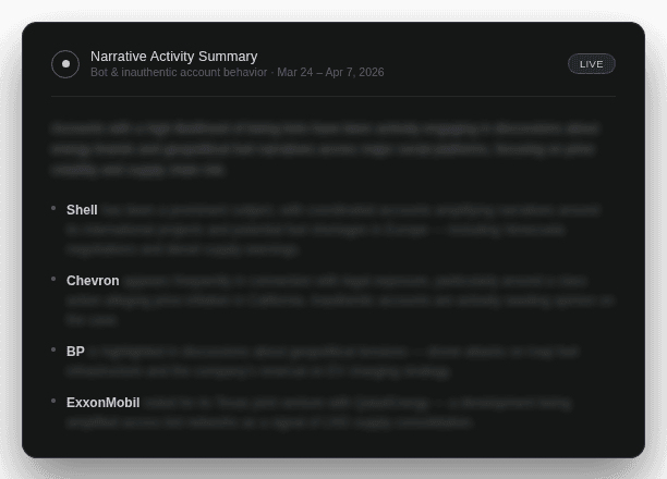 Surface emerging narratives, bot activity, deepfakes, and coordinated campaigns before they reach critical mass. Across platforms, in real time.