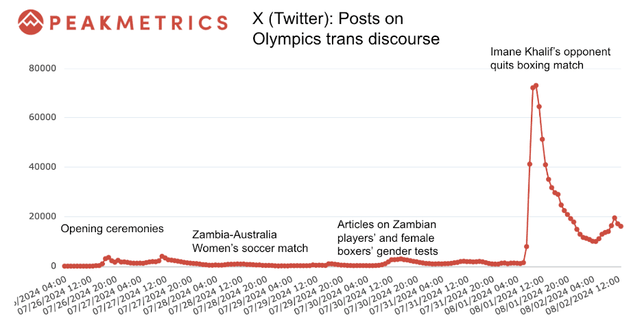 Rather than an organic reaction to the live broadcast of Khelif’s fight and quick withdrawal from Carini, PeakMetrics found indication that activist anti-trans networks began targeting Khelif in the days leading up to the opening ceremonies.